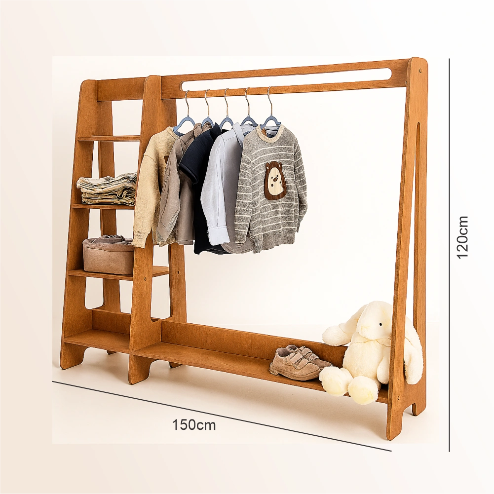 Kids Wooden Clothing Rack with Shelf is a practical and stylish storage unit for kids. It is made from high-quality plywood. The finish is smooth and coated with protective sealer. This helps resist wear and moisture.